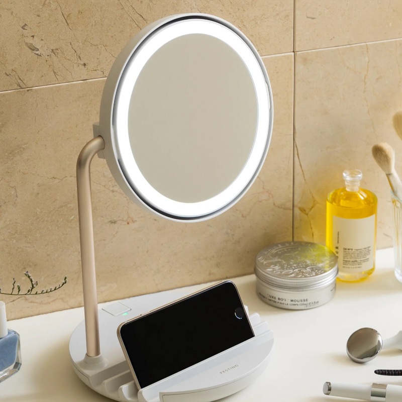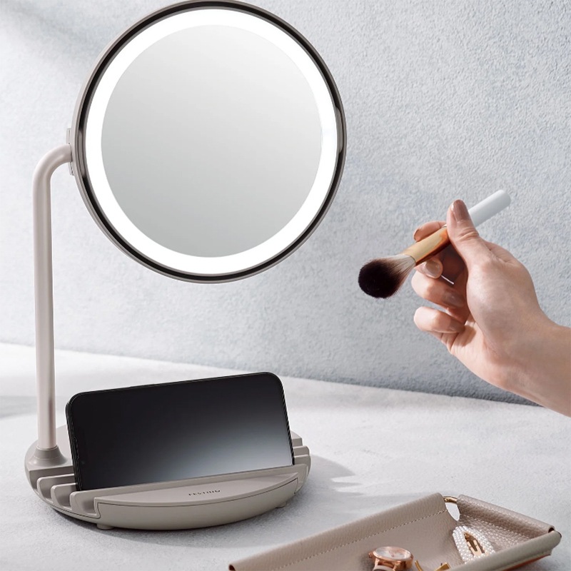 スマホやメイク小物、アクセなどが置ける便利な仕切り付きベース。動画や音楽を楽しみながら充実のメイクタイムを。