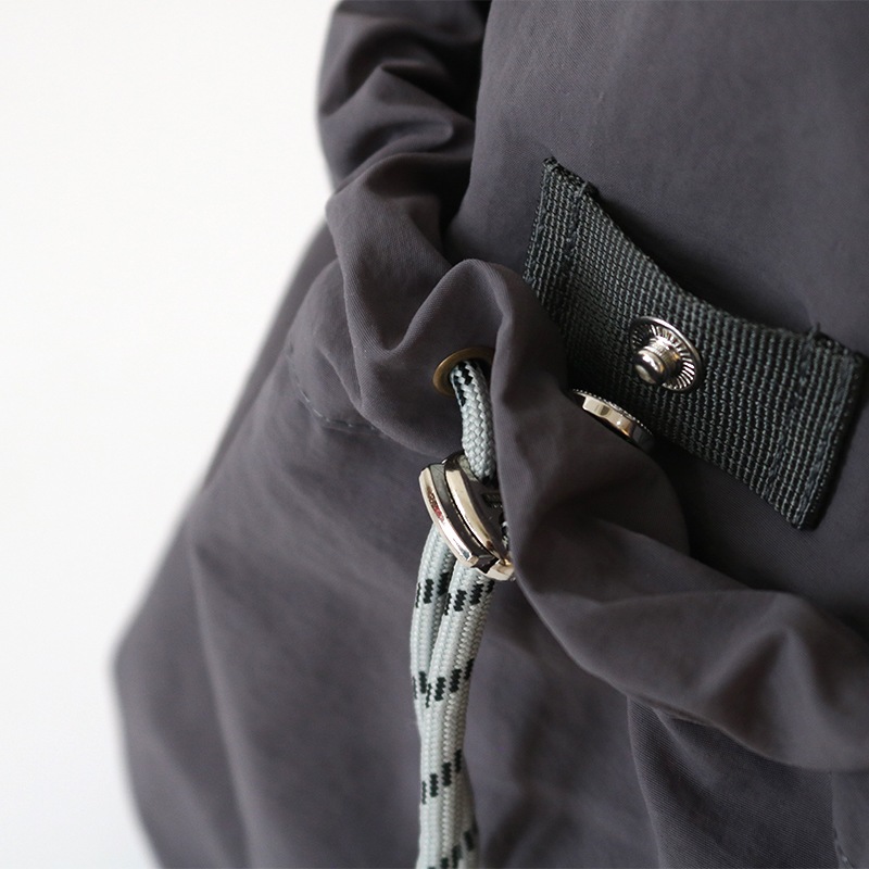表側にある大きなポケットは、中身のサイズに合わせてロープで絞れて便利。