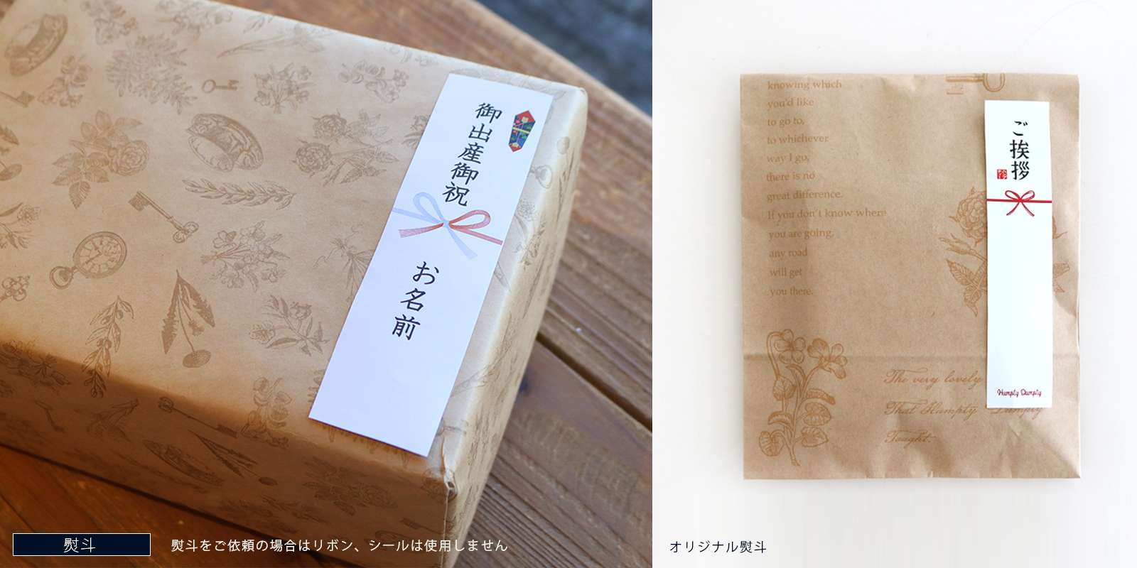 熨斗サービスやお渡し用の袋、メッセージカードにも対応しています。